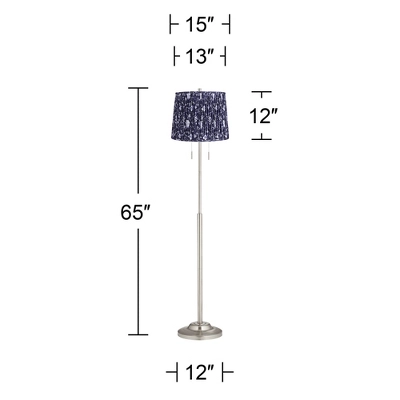 Update your living space with the help of this brushed steel finish floor lamp base. The design is crafted from metal, and has a chic contemporary look that’s ready to be paired with a stylish shade of your choosing. It comes with twin pull chains that rev up the style factor and make it easy to control the light output. Includes a blue and white floral patterned fabric shade. The decorative pattern is set against a navy blue color background, and the shade has a white polystyrene liner. Comes with the correct sized harp.