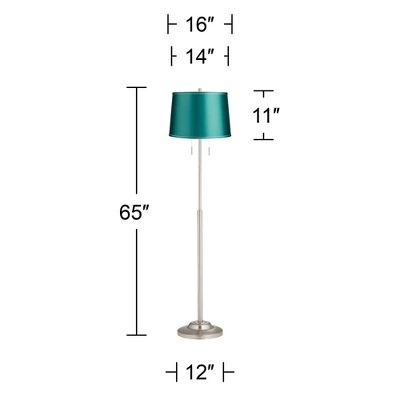 Update your living space with the help of this brushed steel finish floor lamp base. The design is crafted from metal, and has a chic contemporary look that’s ready to be paired with a stylish shade of your choosing. It comes with twin pull chains that rev up the style factor and make it easy to control the light output. Includes a soft teal blue fabric tapered drum shade with silver piping trim detail.