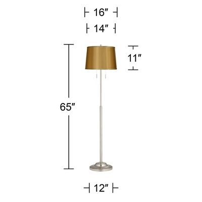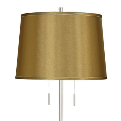 Update your living space with the help of this brushed steel finish floor lamp base. The design is crafted from metal, and has a chic contemporary look that’s ready to be paired with a stylish shade of your choosing. It comes with twin pull chains that rev up the style factor and make it easy to control the light output. Includes a Sydnee gold polyester drum shade with silver piping trim detail.