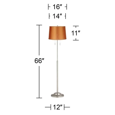 Update your living space with the help of this brushed nickel finish floor lamp. The design is crafted from metal, and has a chic contemporary look that’s paired with a beautiful orange satin drum shade. It comes with twin pull chains that rev up the style factor and make it easy to control the light output.