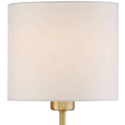 - Brass finish over metal frame. White fabric drum shade with uno style attachment. 5-feet long clear cord.