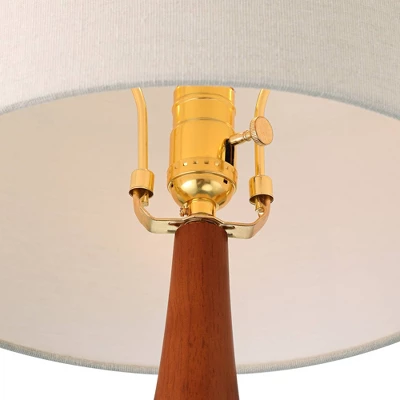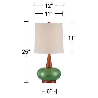 Update your decor into the modern age with this Mid-Century table lamp design from the 360 Lighting brand. The Andi lamp features a playful profile in wood and green ceramic. The ceramic is hand glazed, resulting in a wonderful play of color tones. A tall tapered white fabric drum shade completes the look on top.
