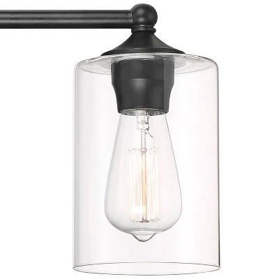 - Black finish. Metal construction. Clear glass cylinder shades. Can be installed with the light pointed up or down. Horizontal installation only.