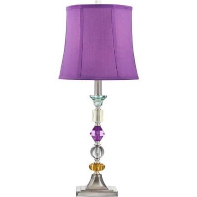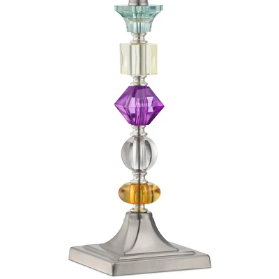 Contemporary lamps add a fun look to your decor. This stylish set of two table lamps is from the 360 Lighting brand. They feature a multi-colored column made up of stacked, geometric form acrylic elements. These colorful elements are set between the square sided base at the bottom and the eye-catching purple fabric shade on top.