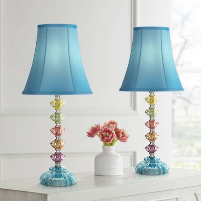 Fun speaks volumes in the design of this set of two glass table lamps, a twist on traditional stacked glass lamp designs. Each lamp’s design features jewel-like pieces of glass in shades of pink, orange, purple, green, and yellow, stacked vertically and separated by silver finish accents. Each lamp sits over a teal blue glass base that perfectly complements a matching bell shade.