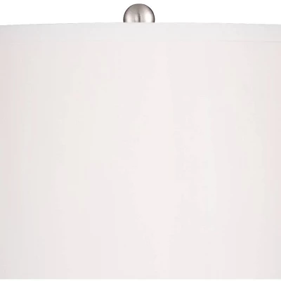 This set of two ultra-chic glass table lamps features a classic design in a sleek fluted motif. A bright pop of blue in the shade complements the modern look. A white drum lamp shade completes the look.