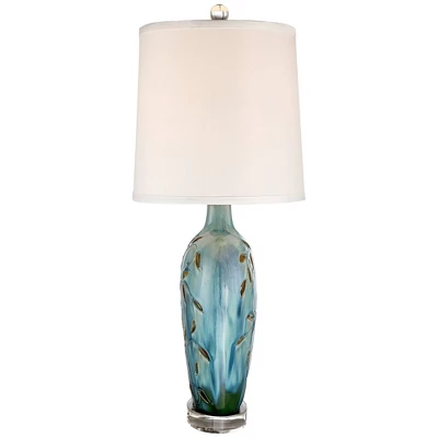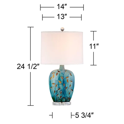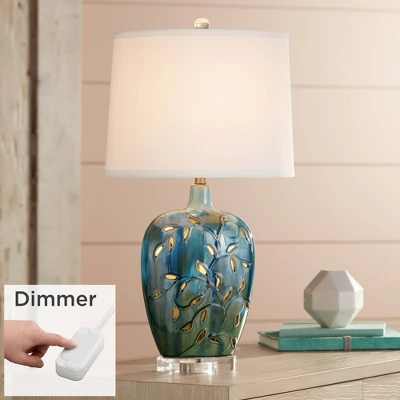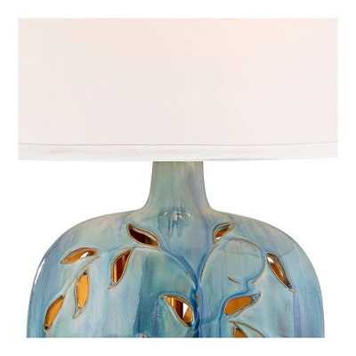 - Blue ceramic lamp body with a decorative open hole leaf pattern. Clear acrylic accent footer at bottom. An elegant look for living rooms or sitting areas.