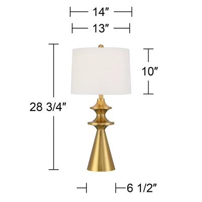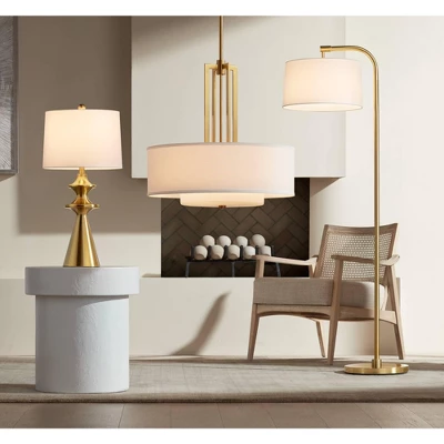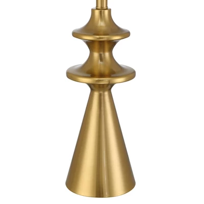 Bring bright modern style home with this sculptural design from the 360 Lighting brand. The lamp base features a cone profile with multi segments at the top for added visual style. The metal base is in a gold finish and up top is a white fabric drum shade that completes the look.