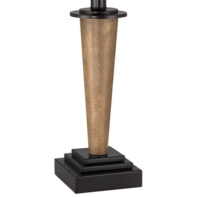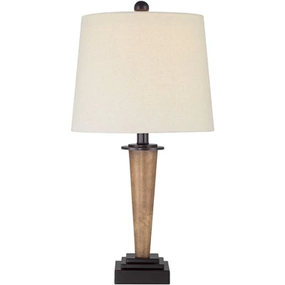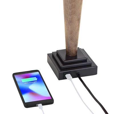 Inspired by rustic and Mission style lamps, the Fernbank table lamps provide a bright look for living room lighting or bedrooms. From the 360 Lighting brand, each lamp has a bronze finish pedestal base with a faux wood center column. A built-in USB charge port in each base allows you to easily keep your phones and other electronics close at hand and ready to use. Up top are white fabric tapered lamp shades.