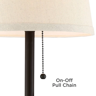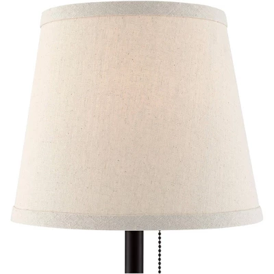 - Bronze finishes, metal construction. Oatmeal round tapered drum Uno shades. 5-foot black cord and utility plug.