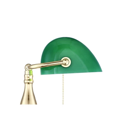 Hit the right note with the retro charm of a set of two banker’s table lamps. These lamps show off a warm brass plated finish, perfect for a display on a side table in a den or on a desktop in your home office. A green glass shade and pull chain switch enhances the old school character of this lovely table lamp set. The banker shade also makes the lamps ideal for use as a piano lamp.