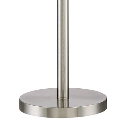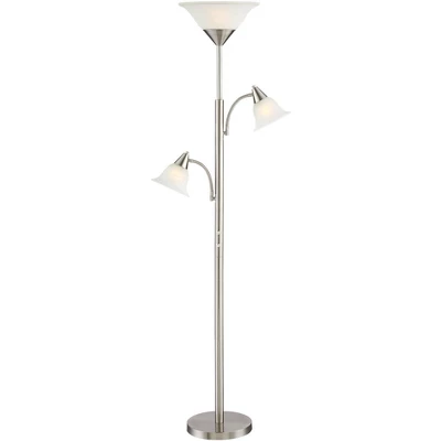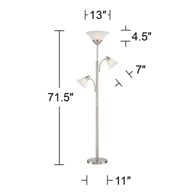 Value-priced from the 360 Lighting brand, the design comes in a sleek brushed nickel finish to the pole, lamp arms and round base. Adjustable gooseneck arm side lights provide bright reading lights. The design features alabaster glass shades that provide a soft glow. There is an on-off switch for the top light. Side lights are controlled by a 4-position switch that turns on the left light, turns on the right light, both on, both off.