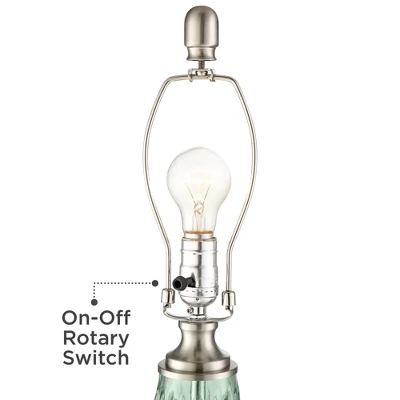 From the talented artisans at 360 Lighting, this modern table lamp is crafted from light seafoam green glass with a translucent quality, featuring a textured pattern of whorls and rounded diamonds. Brushed nickel finish accents and an off-white drum shade add a clean, classic touch. Offering a lovely look for your home, this glass table lamp is perfect for contemporary and coastal style settings.