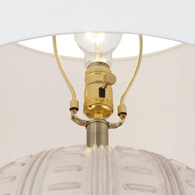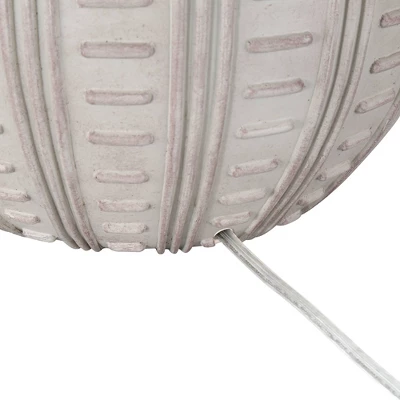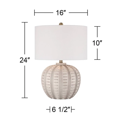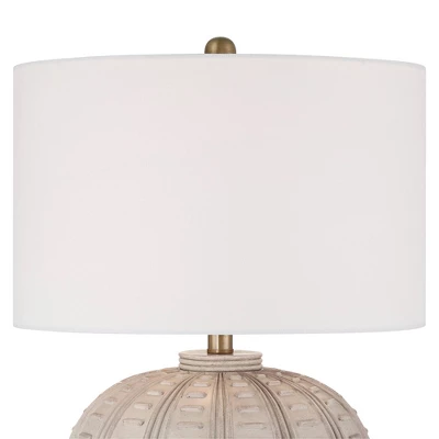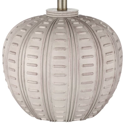 Ideal for contemporary and coastal style room spaces, the Keira table lamp provides an elegantly organic and visual accent. The lamp base has a gourd profile with a decorative vertical and horizontal line pattern. The base is in a cool sand color and is topped by a white fabric lamp shade.