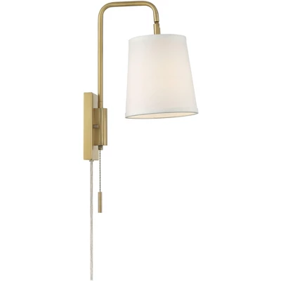 Brighten your modern bedroom space with the Luca warm brass swing arm plug-in wall lamp. From the 360 Lighting brand, this design features a warm brass finish over its metal construction that is offset by a white fabric shade. Easily plug in the lamp, and turn it on and off using the pull chains or on-off switch.