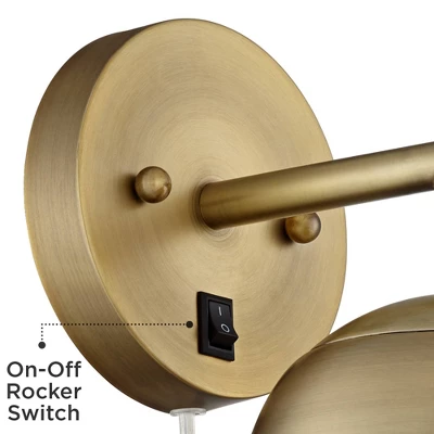 Clean lines define these exceptional plug-in wall lamps set of two from the 360 Lighting brand. Simply stunning in a charming library or living room, each lamp features a spherical silhouette with its upper section in an antique brass finish over metal construction, and its lower half features frosted glass. Cast a beautiful, inviting glow over any room.
