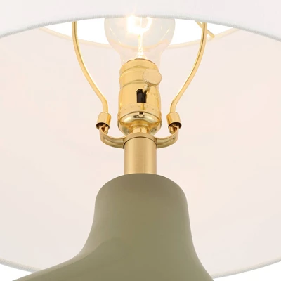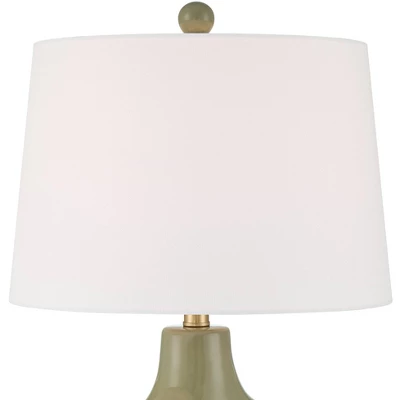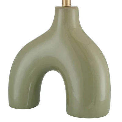 Refresh to look of your modern living space with this ceramic lamp design from 360 Lighting. Inspired by Mid-Century lighting design, the lamp base has a whimsical half-circle, two leg profile done in a lush green ceramic glaze. Up top is a tapered white fabric lamp shade.