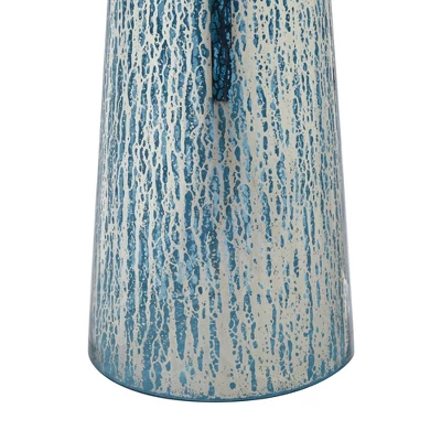 Striking and stylish, this glass table lamp features an eye-catching blue mercury glass finish. The tapered column shape is topped with a white drum lamp shade on top. Ideal for contemporary decor.