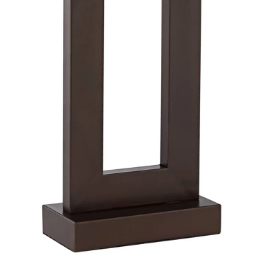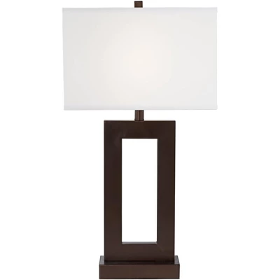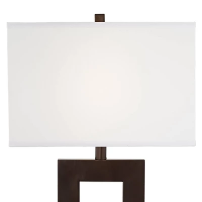 A simple and modern design featuring an open rectangular base adds a sleek look to this set of two open window table lamps. With a contemporary bronze finish complementing crisp white box shades, it presents a versatile palette with compelling contrast. A petite finial at each top adds subtle style. By 360 Lighting.