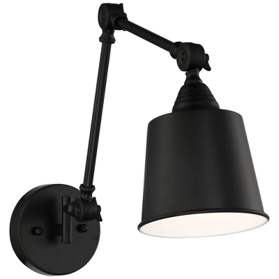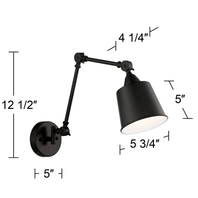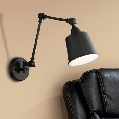 This black wall lamp offers a versatile modern industrial look that works well in any bedroom or living room. The shade shines light downwards, making it perfect for task lighting. This lamp can be adjusted up and down at the lamp head and arm joint and left and right from the adjustment point on the backplate. Note: this is not a plug-in wall lamp, it requires hardwire installation and is operated from a wall switch.