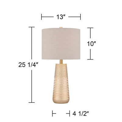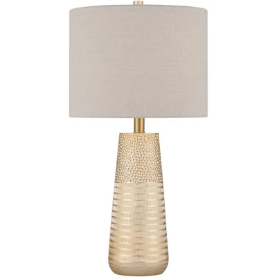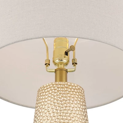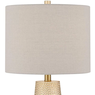 Bring a touch of sophistication to your decor with this set of two textured gold table lamps from 360 Lighting. each lamp features a beautifully detailed gold finish that adds warmth and shine to any space. The clean lines of the base are paired with oatmeal color fabric drum shades, creating a harmonious blend of modern and timeless design.