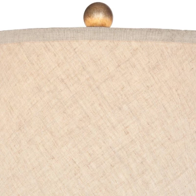 - Tapered off-white fabric drum shades with bronze finish finials. 8-foot long brown cord.