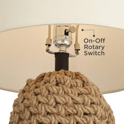From the 360 Lighting brand, this handsome table lamp is a natural for modern coastal decor. The lamp features a woven body crafted from natural rope and wicker elements. The organic-inspired body is rests on a dark brown finish pedestal, and is topped by a tapered drum shade.