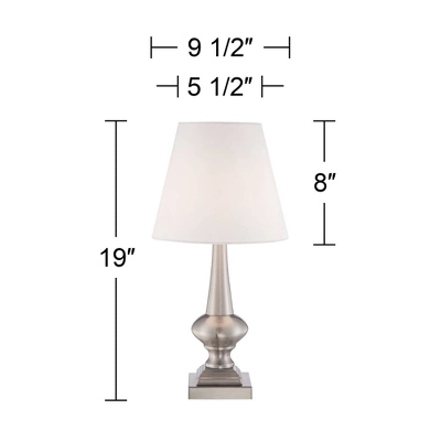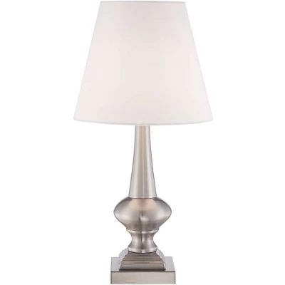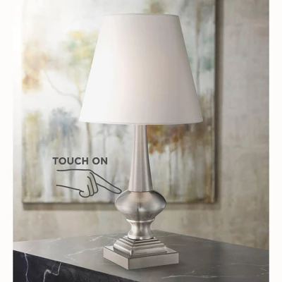 The classic and minimalist inspired design features a brushed nickel finish topped by a crisp white lamp shade. Just touch anywhere on the pedestal base to turn the lamp on or off.