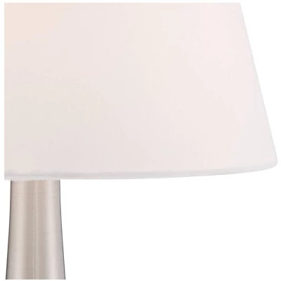 - Metal table lamp in a brushed nickel finish. White bell lamp shade. 6-foot long cord.