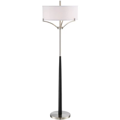 This handsome, modern floor lamp design in black and brushed nickel finish features three metal arms that extend upward to cradle the linen drum shade. This 2-light design is ideal for today’s urban decor. A round black riser is included to give the lamp extra height and presence in a room.