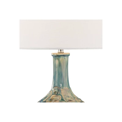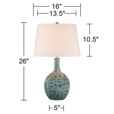 The glossy teal finish is the highlight of this gourd shaped table lamp. The design on the handmade ceramic body features a pattern of staggered squares and rectangles with raised edges to give the lamp a textural quality. The gourd lamp base is topped by a crisp white empire shade. As the base is handmade, there may be slight variations in pattern and color.