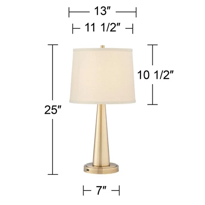 - Set of 2 USB lamps. Each is 25″ high overall. Bases are 7″ wide. Shades are 11 1/2″ across the top x 13″ across the bottom x 10 1/2″ high. Weigh 5.5 lbs.