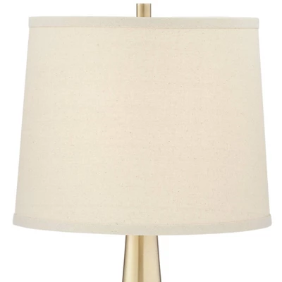 - Brass finishes. Metal construction. Beige fabric tapered drum shades. 7-foot long cords.