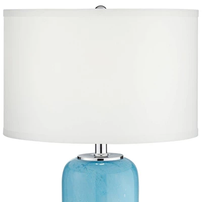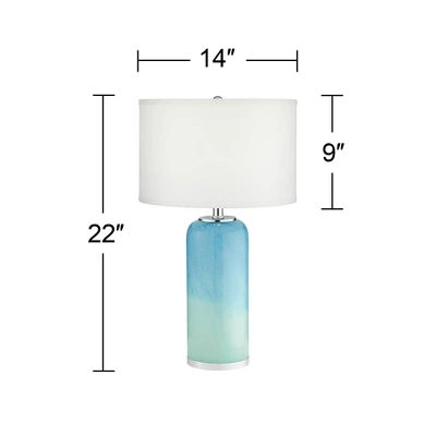 A wonderful art glass table lamp from the 360 Lighting brand. This design comes in a blue glass column that evokes the feelings of sky and sea, with sleek metal accents and bottom base. On top is a white drum shade that acts as a clean finishing touch. This lamp has a built-in nightlight feature within the base. Perfect for a living room or bedroom space.