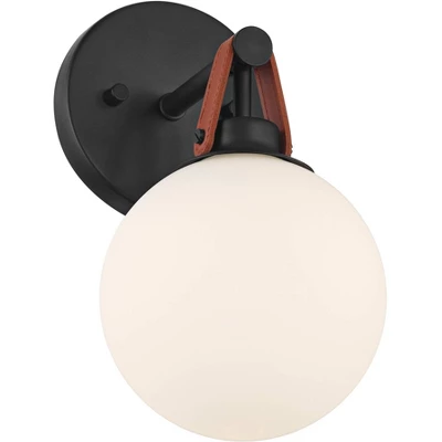 - Black finish over metal construction. White glass globe shade. Brown leather strap.