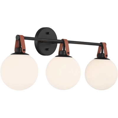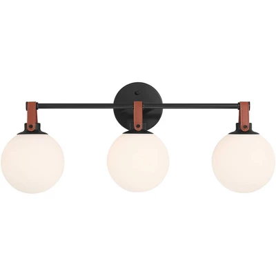 The smallest touch can bring fantastic flair, as if the case with the Nubuck bathroom vanity light from the 360 Lighting brand. A black finish frame and backplate is paired with three white glass globe shades for a beautifully modern two-tone look, diffusing light throughout your space. Additionally, brown leather straps enhance the overall look and feel with additional charm. the Nubukc bath light is damp location rated, perfect for highlighting your bathroom mirror or vanity area.