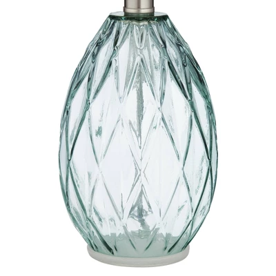 - Blue-green translucent glass construction. Diamond patterned textured body. White plastic trim and base at the bottom. 8-foot long clear cords.