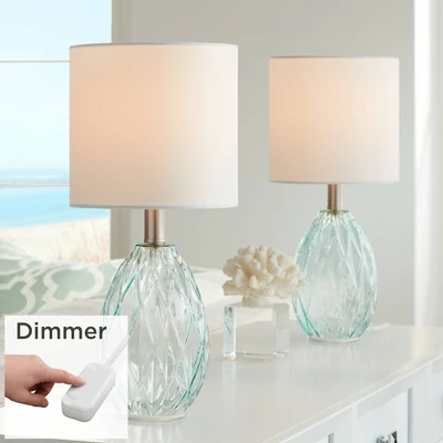 From the 360 Lighting brand, these accent table lamps comes in a translucent blue-green glass construction with a diamond-shaped textured pattern, with an opened-up base bottom. The result is a light and playful modern design, perfect if displayed together or separately. This lamp set comes with two tabletop dimmers, one for each lamp, which allows you to control the level of lighting. Simply insert the lamp plug into the dimmer outlet, and then slide the switch on the control to dim or brighten the lighting.