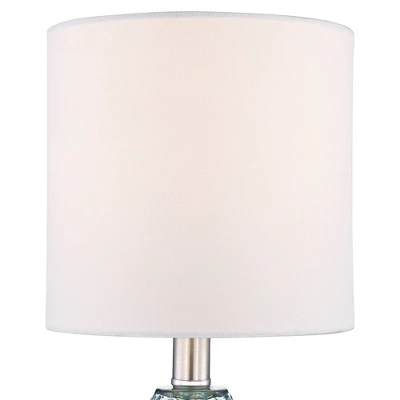 - Blue-green translucent glass construction. Diamond patterned textured body. Open bottom design. White fabric drum shades. Lamps have an 8-foot long clear cord.