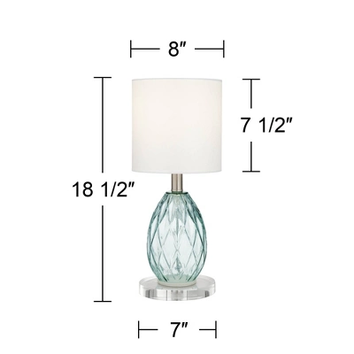 From the 360 Lighting brand, these accent table lamps come in a translucent blue-green glass construction with a diamond-shaped textured pattern, with an opened-up base bottom. The result is a light and playful modern design, perfect if displayed together or separately. Each lamp comes with a 7″ round acrylic riser. Place the riser under the lamp bases for added lamp height and style.