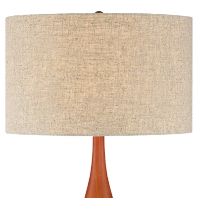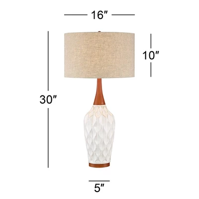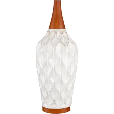 Inspired by the clean lines and architectural elements of a Mid-Century aesthetic, this modern table lamp combines wood and ceramic material. The ceramic body features a wave-like pattern and a thin tapered wooden neck. A drum lamp shade in a warm color completes the look.
