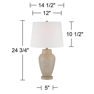 - Set of 2 lamps. Each is 24 3/4″ high overall. Round bases are 5″ wide. Shades are 14 1/2″ across the bottom x 12″ across the top x 10 1/2″ high. Weighs 4.4 lbs.