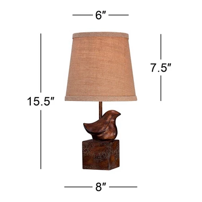 Add a sculptural element to your decor with this set of two small accent table lamps, which features the delightful profile of a bird. The contemporary sculptural bird in a bronze-brown finish sits on a cube base with a crackled duo-tone finish. A burlap drum shade lends a natural touch to this modern design with an organic look.