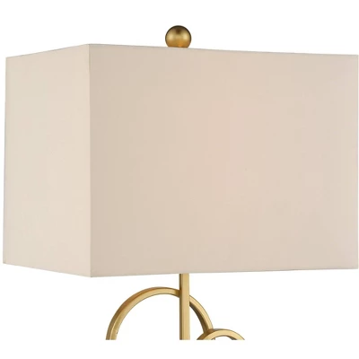 Five metal rings in a brass finish overlap to create an intriguing open design on the Saul modern table lamp. An oatmeal box lamp shade completes the look. Ideal piece for nightstands or side tables.