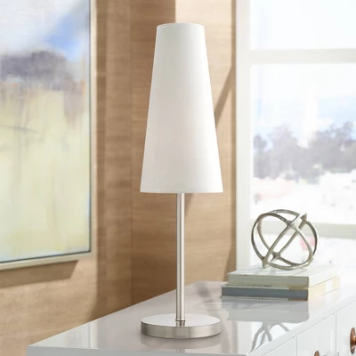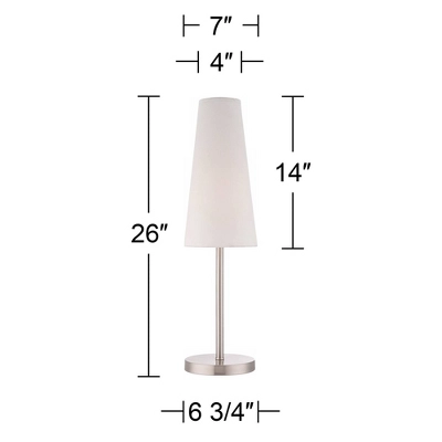 Nickel and white together can create beautiful home accessories with a decidedly modern look. This slender accent lamp set features a brushed nickel base and round stand, and a clean white cone shade. Ideal for any room that needs a sleek, contemporary accent.