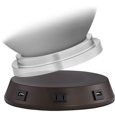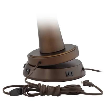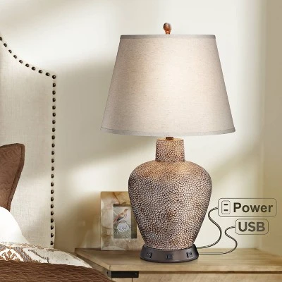This attractive table lamp boasts a beautiful hammered base in a shimmering bronze-brown leaf finish. Elegantly topped with an off-white shade, this design is a great way to add light and style to a room. Inspired by Southwestern and Western style decor. This table lamp comes with a bronze universal charging station at the bottom, which can be removed and used with other lamps. The charging station has two built-in USB ports and two 2-prong outlets, allowing you to charge up to four devices at a time.
