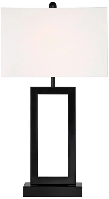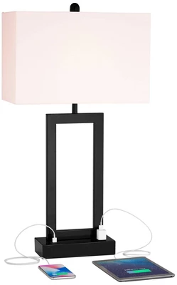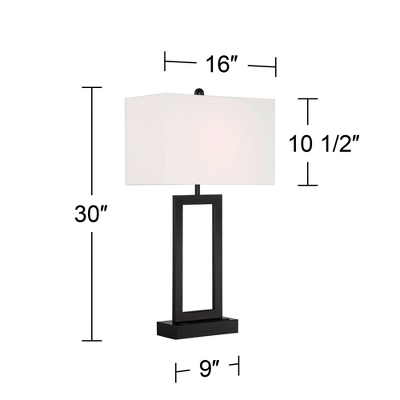 Update a custom contemporary space with a pair of lamps adding minimalism with functional bonuses. This set of two modern metal table lamps from the Todd collection by 360 Lighting employs simplicity and clean lines to achieve sophistication with black finish metal construction calling attention to a rectangular open design. Rectangular white fabric shades provide perfect contrast, and built-in 2-amp USB ports join an electrical outlet to make each lamp a de facto charging station.