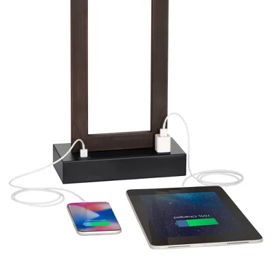 - Built-in 2 amp USB port and an electrical outlet on the base for charging smart phones and other devices. 8-foot long brown cord and plug.