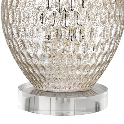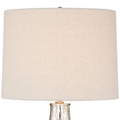 - Dimpled, textured base Mercury glass base. Glass construction. Off-white tapered drum lamp shade. 8-foot long cord.