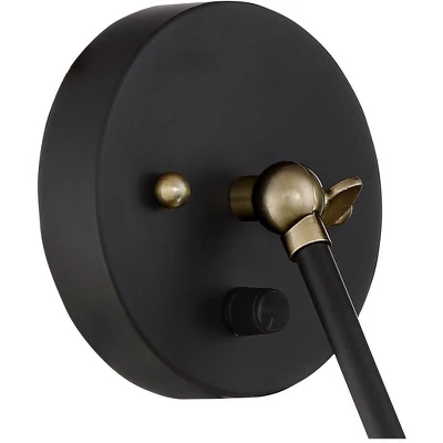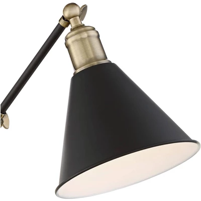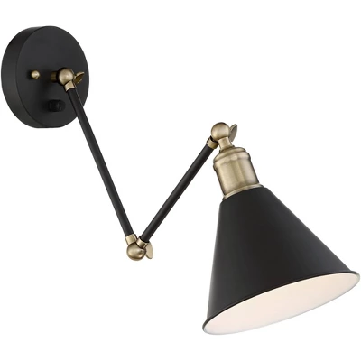 Handsome and functional, this beautiful wall lamp set features down shades that direct light down. Combining a black finish with antique brass details. A dimmer switch on the backplate controls the light intensity.